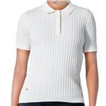 This Madelene is a sleeveless cable knit button front polo and it's ideal for layering. Added style features include an all-over front/back cable knit, it has a rib knit collar, a 4-button covered placket with the top button visible, has a metal right front Daily Sports mini logo medallion and a wider rib knit sleeve opening and bottom band.