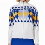 These Intarsia graphic knit cardigans are as comfortable as they are beautiful. The feature a placed multi color argyle band at the front, back and sleeves over a light ivory tone background.