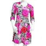 This Zebra-Mums print is chic, sophisticated and pretty with flower tones in hot and soft pink and red over black and white zebra and leaf prints. The dress features a mini standing collar, a "Y" styled open neckline with extending placket that is covered in a double ruffle frill detail and has a straight cut hemline. The dress measures 36" inches from shoulder to hem.