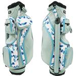 These Ultra-Light-Weight fashionable golf bags weight in at under 5 lbs. and are a great value priced cart bag. This model option is called the Abstract Multi which has a muted silver body and is contrasted with blue, teal, light pink and light grey tones over a white background.